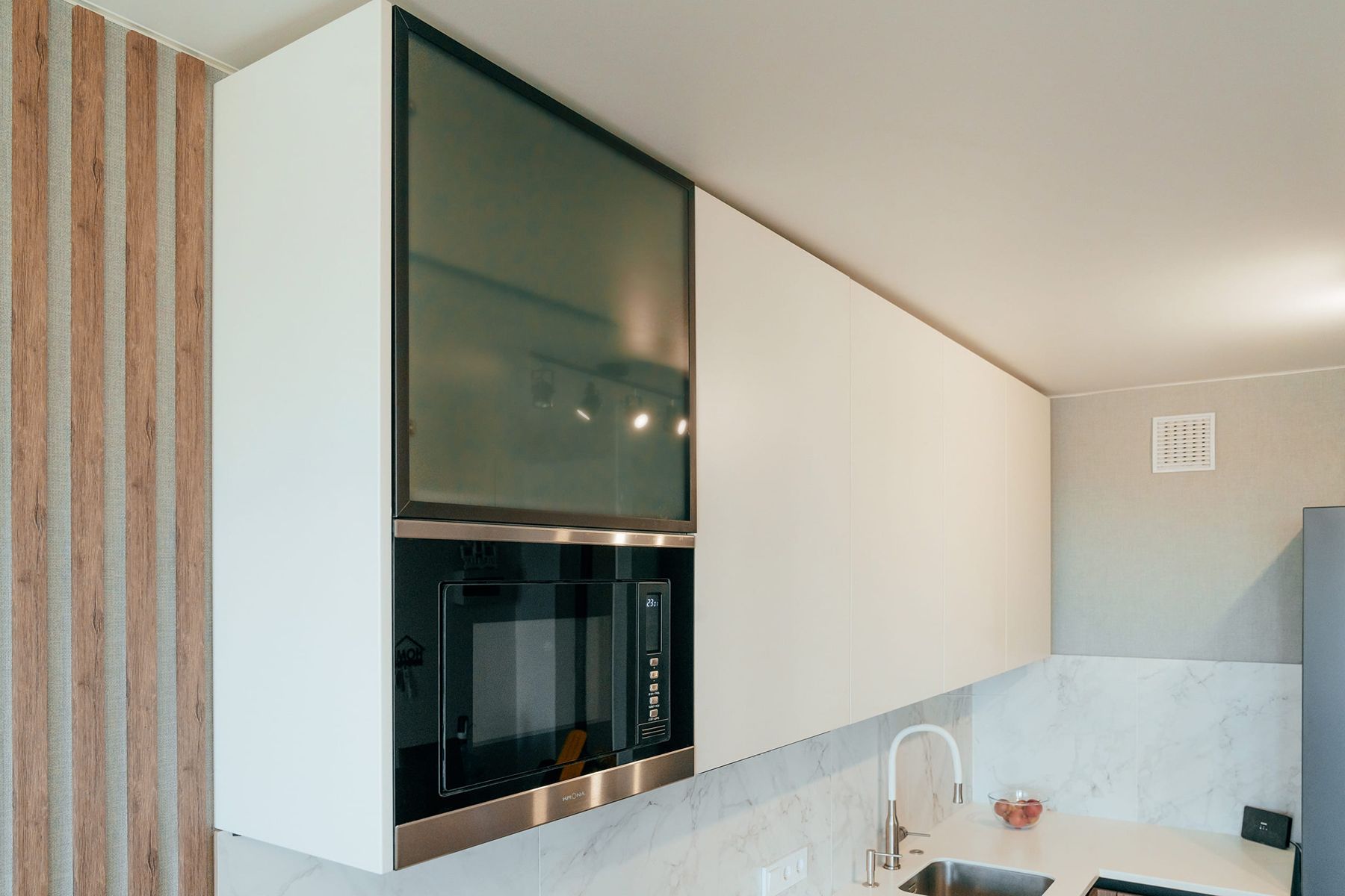 Этот проект посвящен созданию гармоничного и функционального пространства для жизни. Задача состояла в том, чтобы объединить кухню и гостиную в единый ансамбль в лаконичном стиле минимализм, предусмотрев место для отдыха у телевизора и скрытые системы хранения.