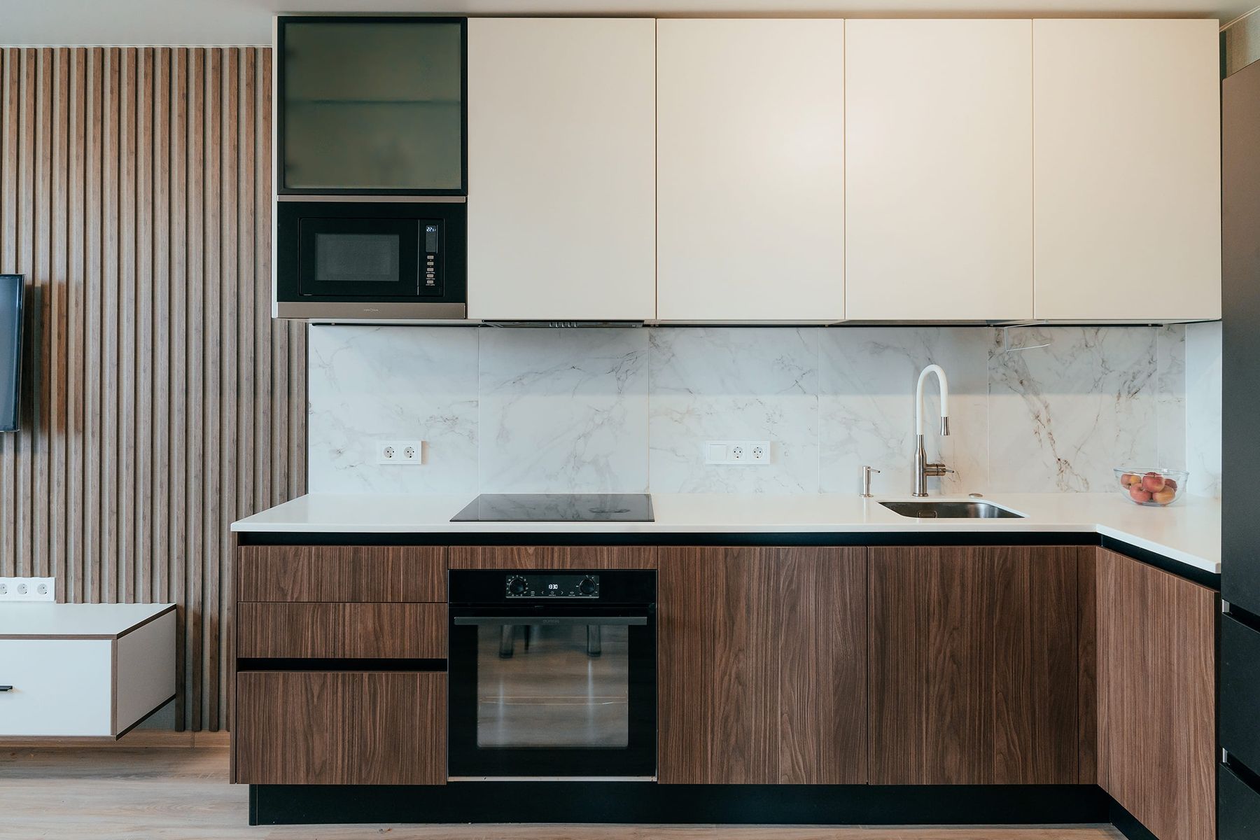 Решением стал кухонный гарнитур и модульная мебель для гостиной, выполненные в единой стилистике. Четкие линии, скрытые ручки, монохромная или натуральная цветовая гамма создают ощущение порядка и простора. ТВ-зона органично вписана в общую композицию: низкая тумба не перегружает интерьер, предоставляя место для техники и хранения. Функциональное зонирование достигнуто за счет мебели и света.